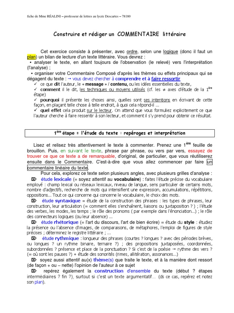 Vous pouvez lutiliser pour. La lecture La lecture du texte est une étape essentielle. Construire et rédiger un COMMENTAIRE littéraire Cet exercice consiste à présenter avec ordre selon une logique donc il faut un plan un bilan de lecture dun texte littéraire. En cela la langue doit être impérativement soignée f aire attention à la.